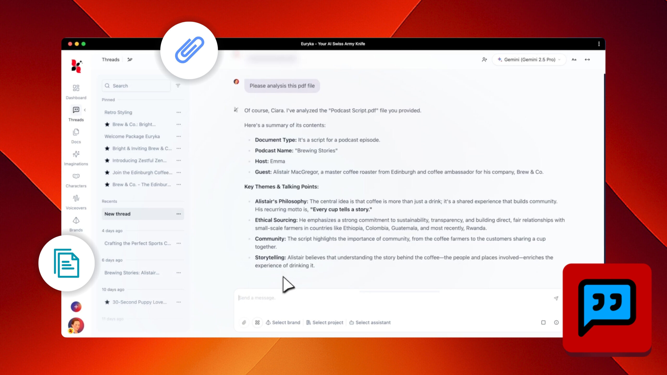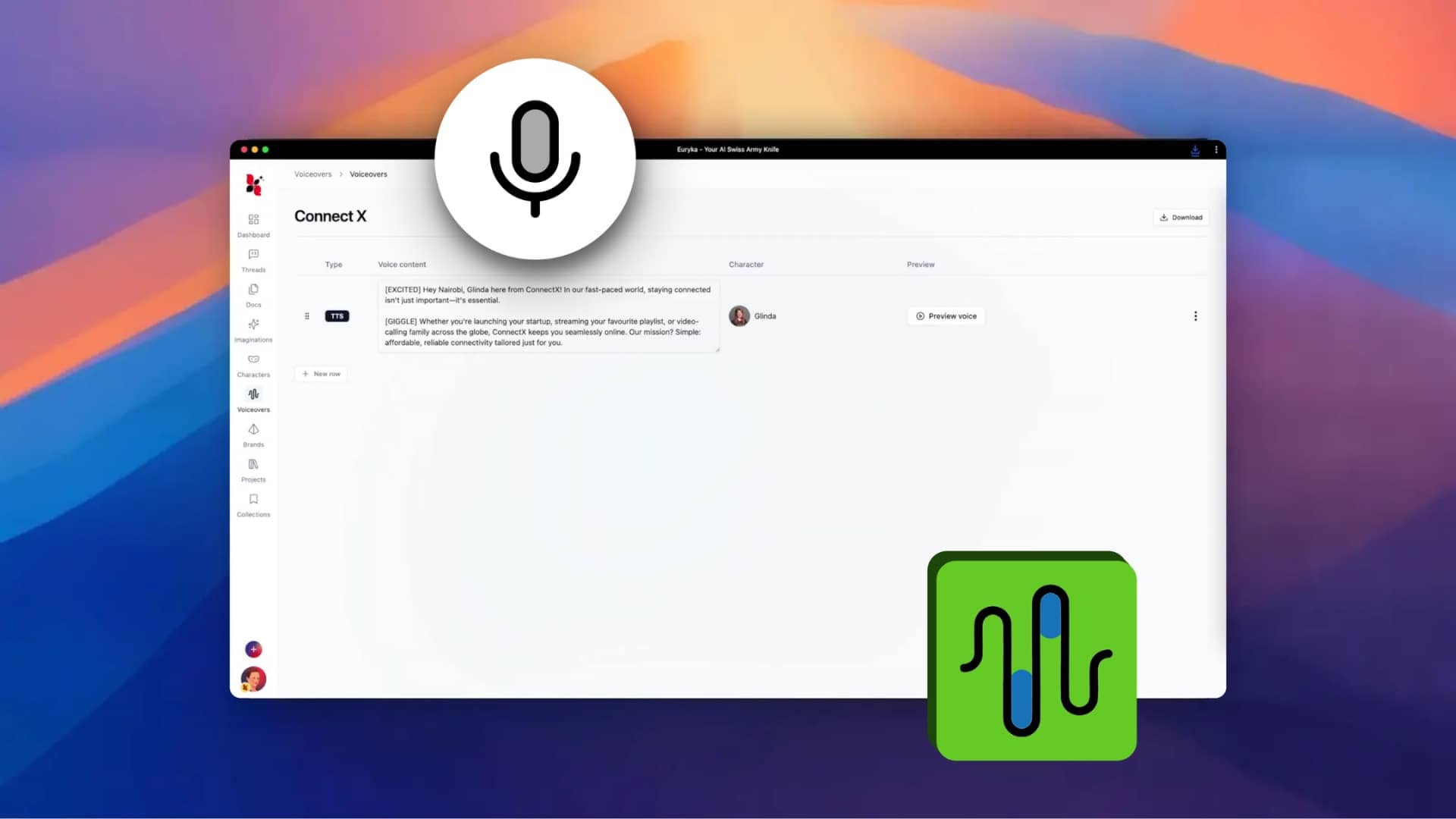 Euryka Characters gives your brand a human touch with AI-powered voices and custom personas. Shape your brand's unique personality to ensure every interaction, from text content to audio, is consistently on-brand and connects with your audience. Seamlessly use your personas in Threads to generate on-brand written content, or bring them to life with Voice Overs ...