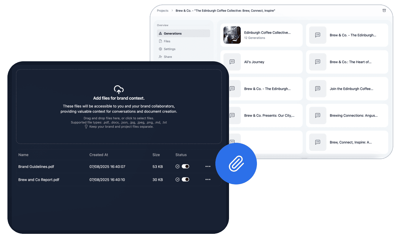 Upload brand guidelines, campaign briefs and creative assets (PDFs, images, documents). Connect Google Drive for real-time synchronisation, so your team and Al always work from the latest information.